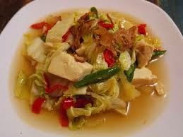 Bahan : 200 Gram sawi putih, potong besar. 2 Buah tahu putih yang besar, potong dadu, goreng setengah matang. 100 ml Air putih. 3 Sendok makan minyak, untuk menumis.